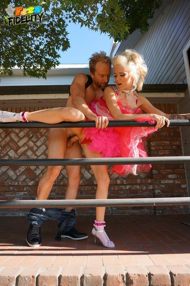 Halle Von prom dress is hiked up and her thong pulled over to get his cock in her wet shaved pussy!